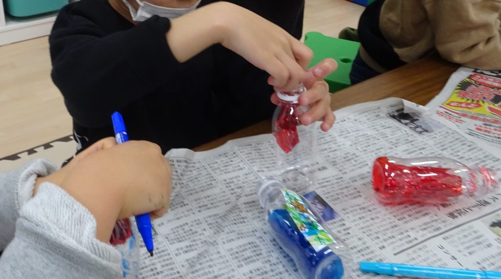 午後は、R1ペットボトルを使った新幹線作りをしました。