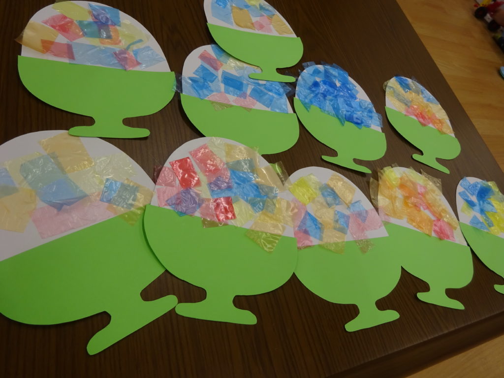 今日は、画用紙に乗りをつけ、好きな色のスズランテープを貼って、