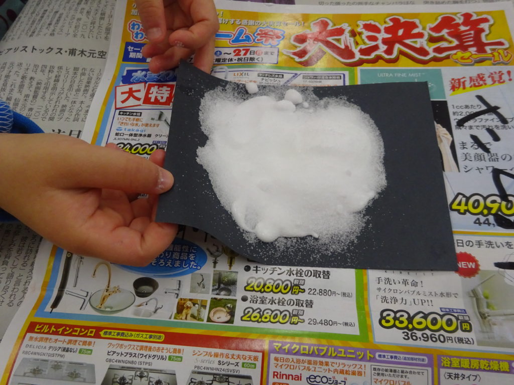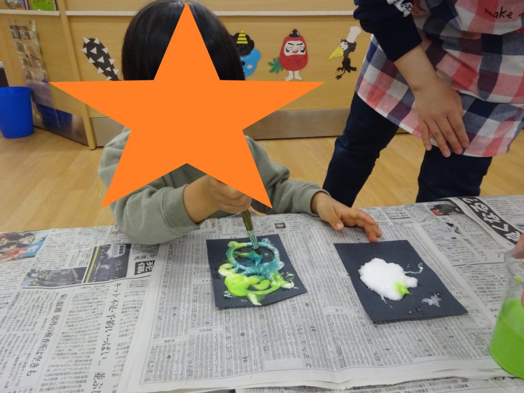 塩のついた部分に絵の具を垂らすとじゅわーと絵の具が広がっていく様子をみて