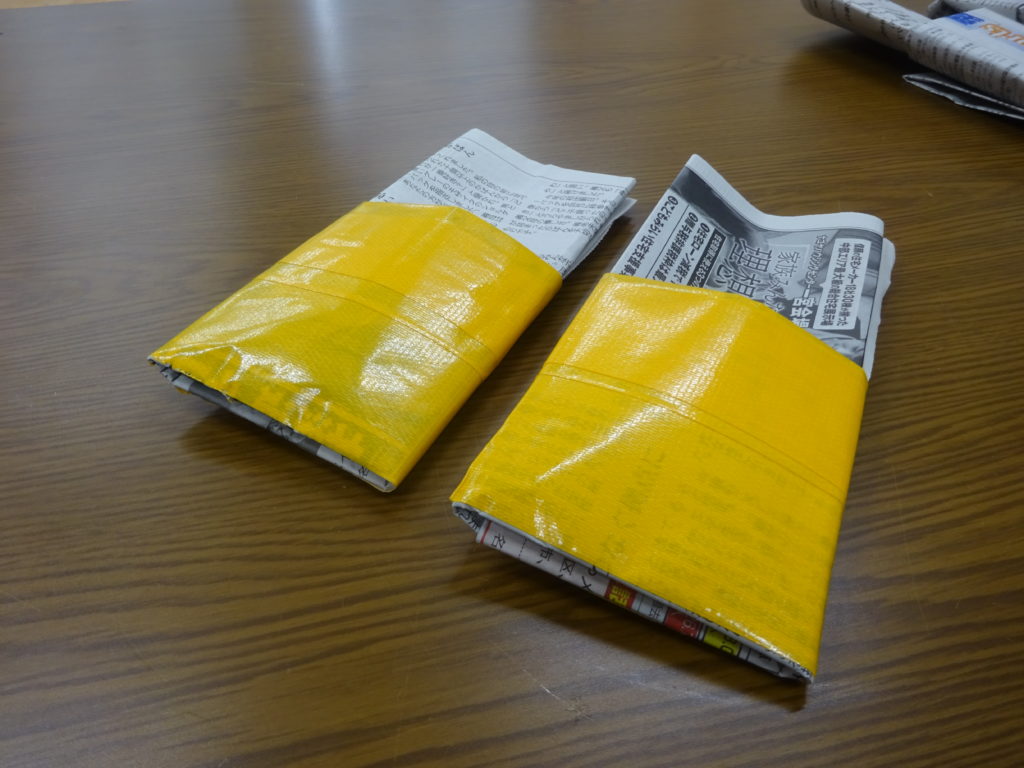 今日は、防災知識のひとつで、避難時など実際履けるスリッパを作りました。
