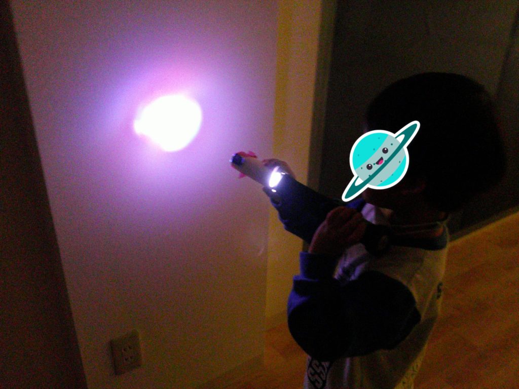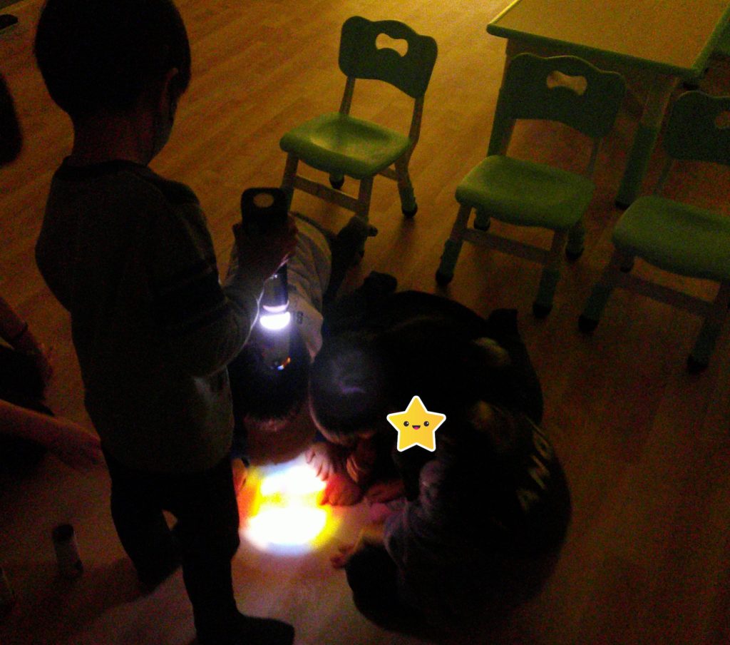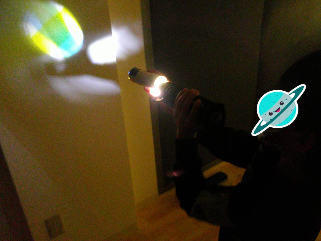 カラフルなセロハンをトイレットペーパーの芯に貼り付け、ライトの光を当てました。明るい部屋の中でもセロハンの重なった場所の色の変化に気が付くことができましたが、部屋を暗くして、光を当てると、色がより鮮明に見え、子どもたちも、光を指さして、「あ!みどりが見える!オレンジが見える!」と興奮気味に教えてくれました。