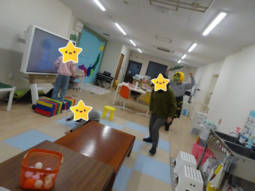 本日は段ボールを使ったフォトスタンド作りと光と音楽の癒し空間スヌーズレンの体験と、豆まきを行いました。