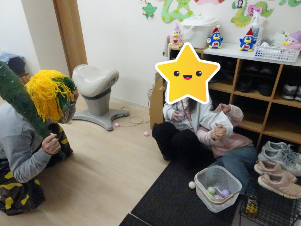 豆まきでは突如現れた鬼に仰天!!必死で逃げる子や先生の後ろに隠れている子、頑張って「鬼は外!」と追い出している子様々です。何とか鬼を退治して一安心(^^)厄災の鬼はど厄か遠くに飛んでったかな?
