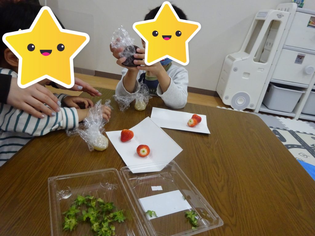 本日のおやつはいちご大福でした。いちごをあんこに包む際、包みやすいようにサランラップに1個分入れ、おせんべいのように平らにし真ん中にいちごをおいて包みました。低年齢の子でも、先生に補助してもらいながら包むことができ、感触や力加減も考えながら作ることが出来ました。