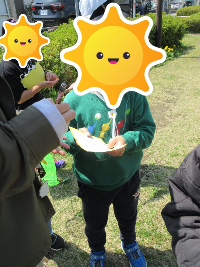 今日の午前中は公園へ春を探しにいきました!教室内で、春に公園で見つけられそうなものをビンゴカードに描いて準備!「え~なんだろう、、たんぽぽとか?」「ブランコ、、はずっとあるものだもんね」「ハチっているかなあ」と色々考えて書いてくれました👍