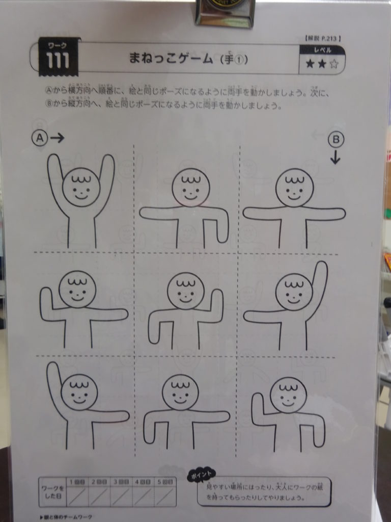 今日はビジョントレーニングを行いました。先生がまずポーズを見せました。「こうやってできるかな?」と聞くと「やってみたい!」「できないよ~」という声もありましたが、いざやってみると「こう?」「あってる?」と確認しながら行う姿が見られましたよ😊
