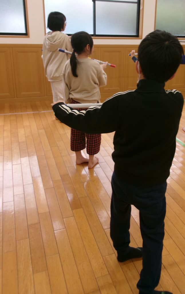 また、2人・3人で向かい合い、『せーの!』と掛け声に合わせて同時にコグトレ棒を投げてキャッチにも挑戦しました。難しい動きにはなりますが、上手く取れなくてもめげることなく、励まし合いながら頑張っており、たくましかったです👏