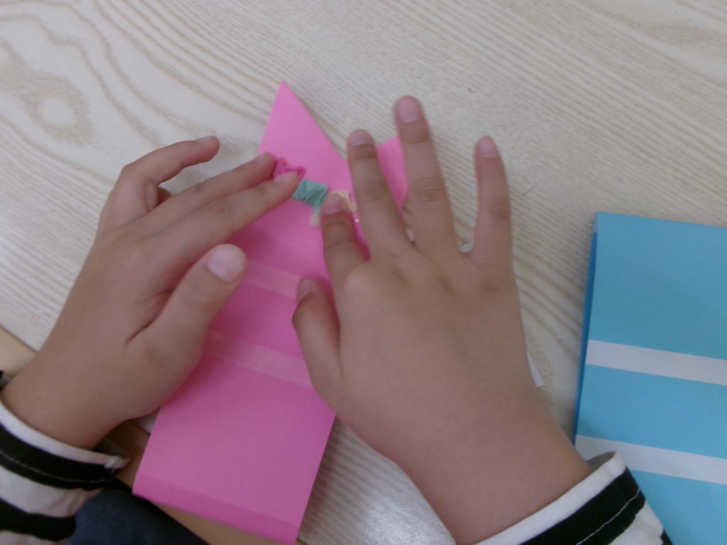 こいの鱗は、花紙をひねったり丸めたりして再現しました。子どもたちは、真剣な表情をして作っていました。回転球も花紙で再現しました。花紙をめくるのは難しかったようで、スタッフが横に付きながら作っていきました。