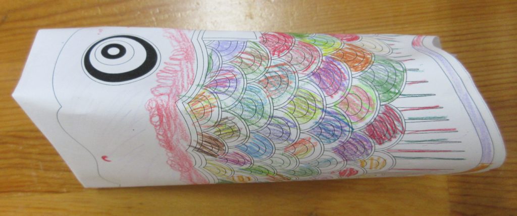 こいのぼりの絵柄に好きな色で塗り、4回ほど口の部分を山折りして輪っかの状態に貼り付ければ完成です。