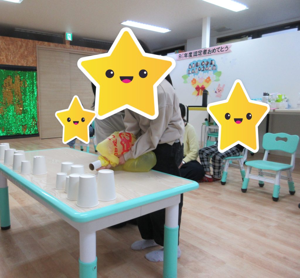 「うまくできない~」「むずかし~」と言いながらも、何度かチャレンジして上手くできる方法を考えて取り組むことができました。みんなで応援し合うことや、コップが倒れた時に拍手をするなど盛り上がりました☺