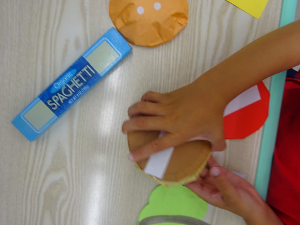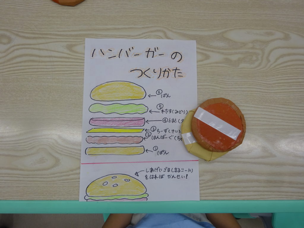 まず最初にハンバーガー作りにチャレンジ!先生が事前に用意したレシピをみながらその順番通りに積んでくれていて、具材を貼る時も両面テープが付いている面同士でくっ付けてしまわないように気を付けながら慎重に貼っていってくれていました😊