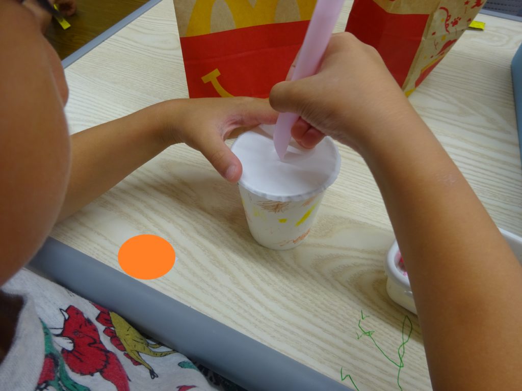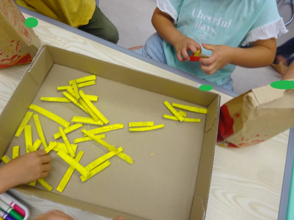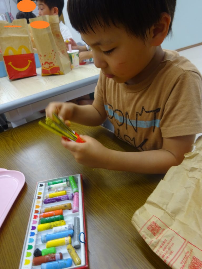 メインが完成した後はサイドのジュースとポテト作りに取り組みました、ジュースのコップには子ども達に絵を描いて貰いましたが、好きな色を沢山使って模様を描く子やいつもお店でりんごジュースを買って貰っているからと美味しそうなりんごを描いてくれている子も居ました🥤🍎