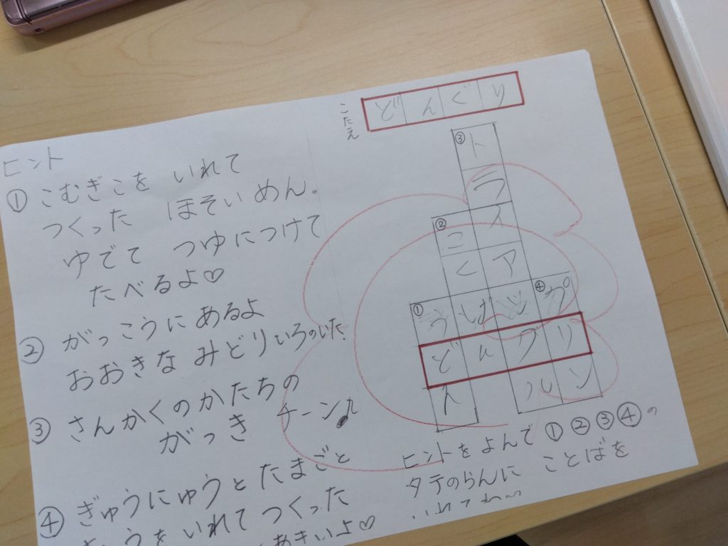 2025年05月27日 ゆめなーる稲沢教室 クロスワードパズルに挑戦! 令和7年5月27日(火) 今日は、クロスワードパズルに挑戦しました。 ヒントを元にマス目を埋めていき、「この答え何だろう?」と思うものは、ヒントをスタッフに聞いていました。 「のから始まる・・・?ごはんとのり・・・?」とじっくり考えて「海苔巻きだ!」と思いついたときには、とてもすっきりした顔をしていました。 全部のマスを埋めて答えが分かった時には「できた!!」ととっても嬉しそうでした。 記事一覧に戻る