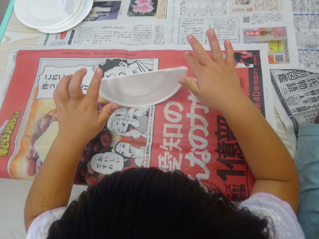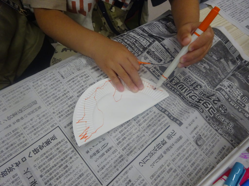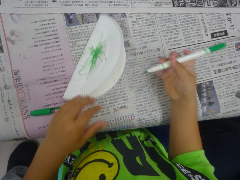 まず最初に子ども達には紙皿を半分に折って貰い、側面には好きな色のペンで色塗りをしてもらいました♪先生の見本を見て真似をしたり、2色使って素敵な模様を描いてくれていましたよ✨