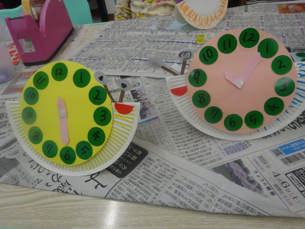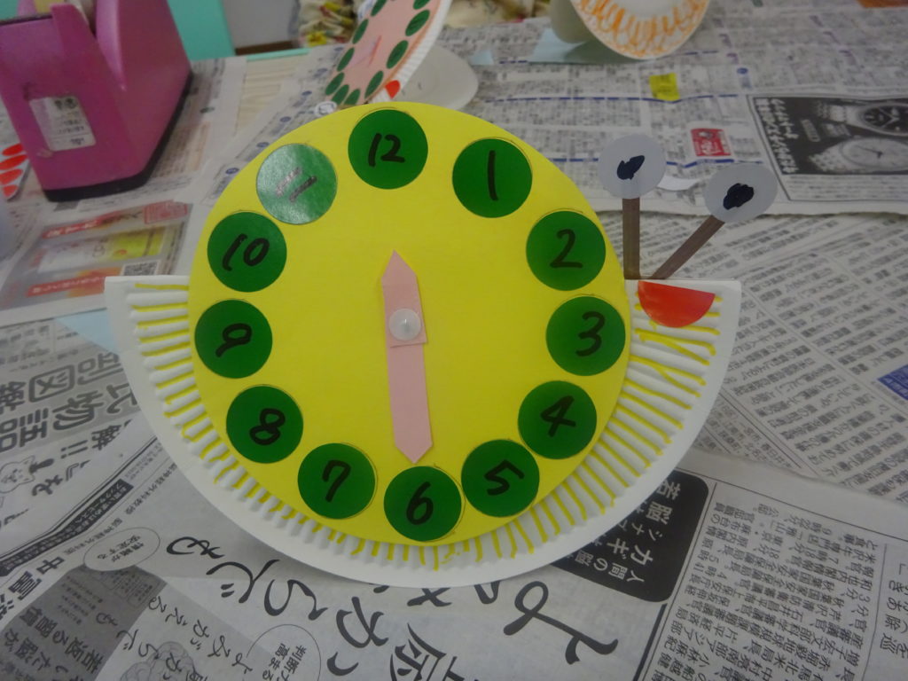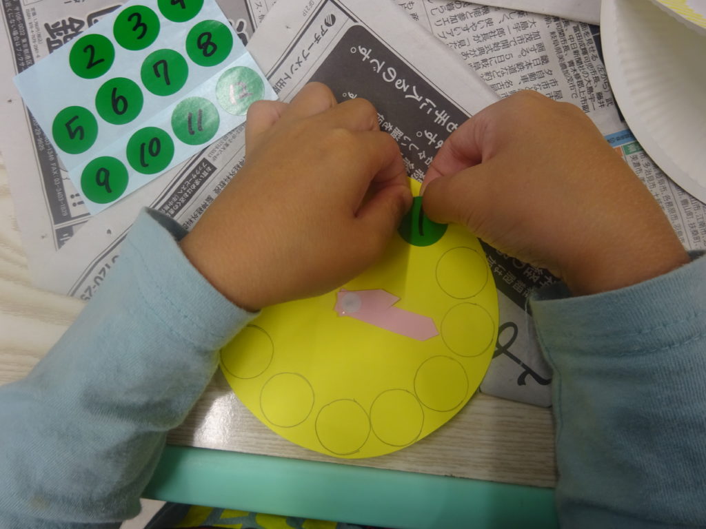 最後は今回のメインになる時計作り!1から12までのシールを順番通りに貼る時には何人かは教室にある時計の方を何度か確認しながら貼る姿がとっても可愛かったです💕