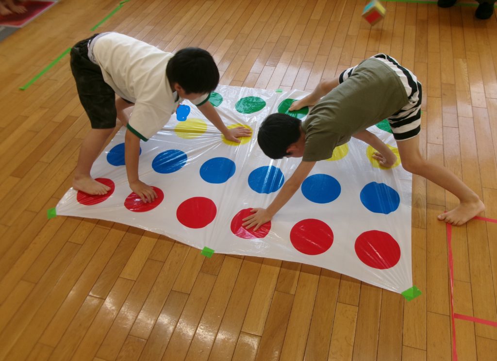 ツイスターとは、4色のサークルマットの上で指示に従い、手足を動かしていくゲームです。バランスを崩さないように体制をキープできるかが重要です。