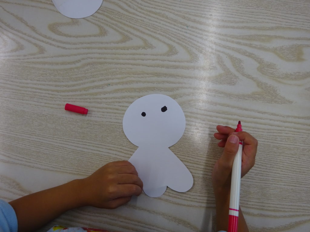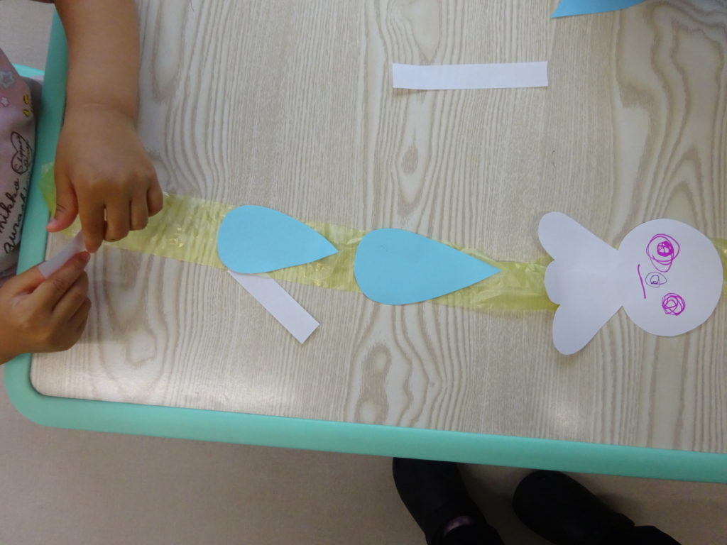 画用紙にお手本を見ながらお顔を描いたり、しずくの形も一緒にビニールひもに