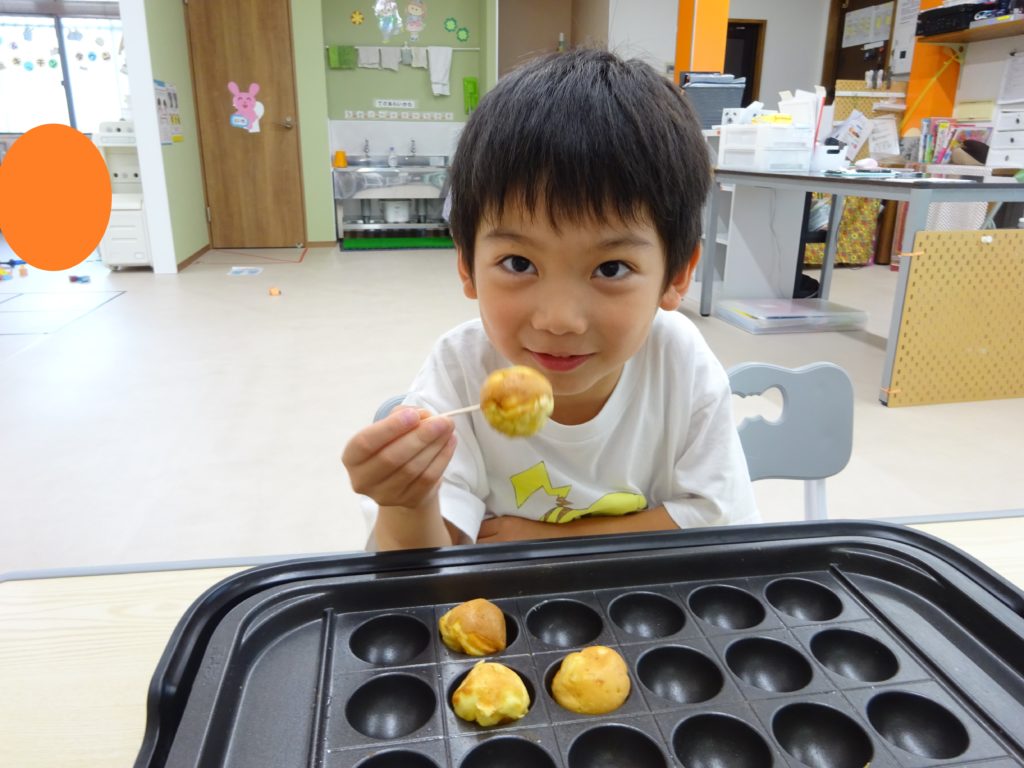 今回ぷちで作るアメリカンドックはプレーンとチーズ入りの2種類!タコ焼き器で先生と一緒に竹串を持ってくるくると回しながら焼きました♪ひっくり返す時の力加減が意外と難しかったようで「せーのっ!」の声掛けで一緒にひっくり返すと、綺麗にまん丸く焼く事が出来ました☺️