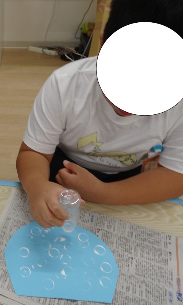 金魚を折り紙で折ったり、袋の中に入れる水草や水を型取りしてハサミで切ったり、ペットボトルの容器で水を再現したスタンプをしました!!