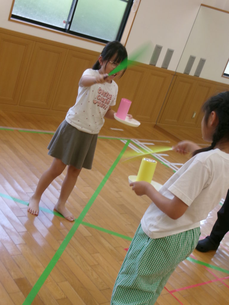 午後のうちわ遊びでは、左手は缶をのせた皿を持ち、右手に持ったうちわを仰いで相手の缶を倒すというゲームをしました。うちわではたくのは無しにしたので、みんな一生懸命うちわを仰いで倒そうと頑張っていましたよ!