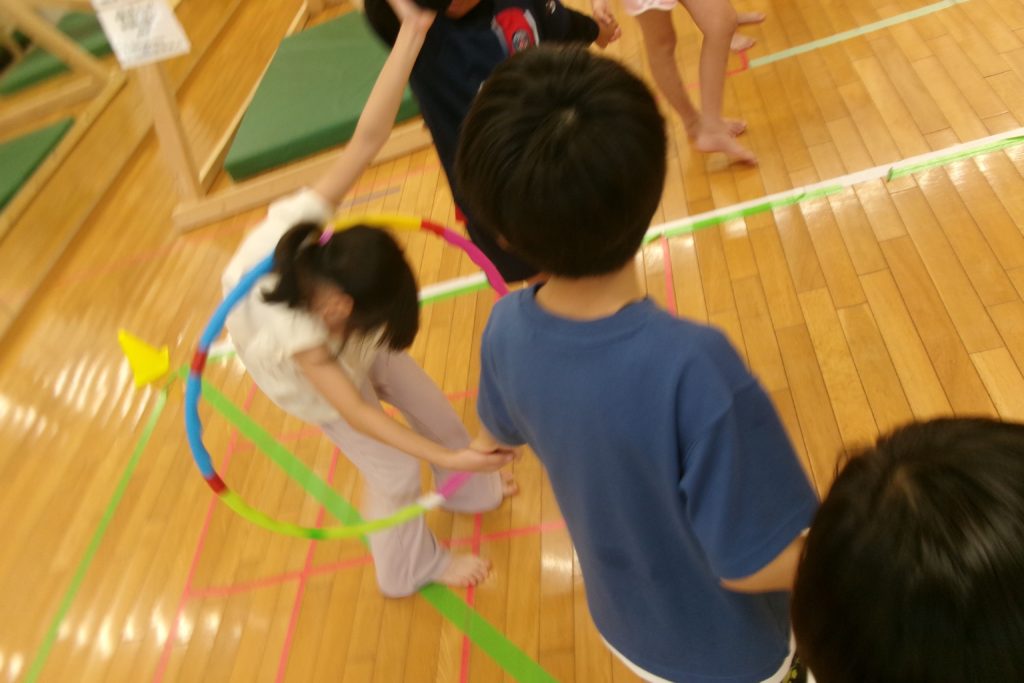 最後は、全員で手をつないでフープを端から端まで通していきました。子供たちは全身を使いながらフープを通すことができました!
