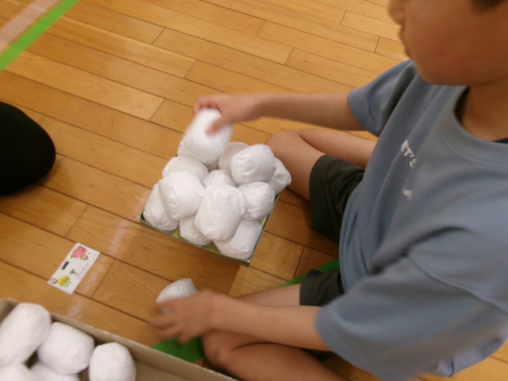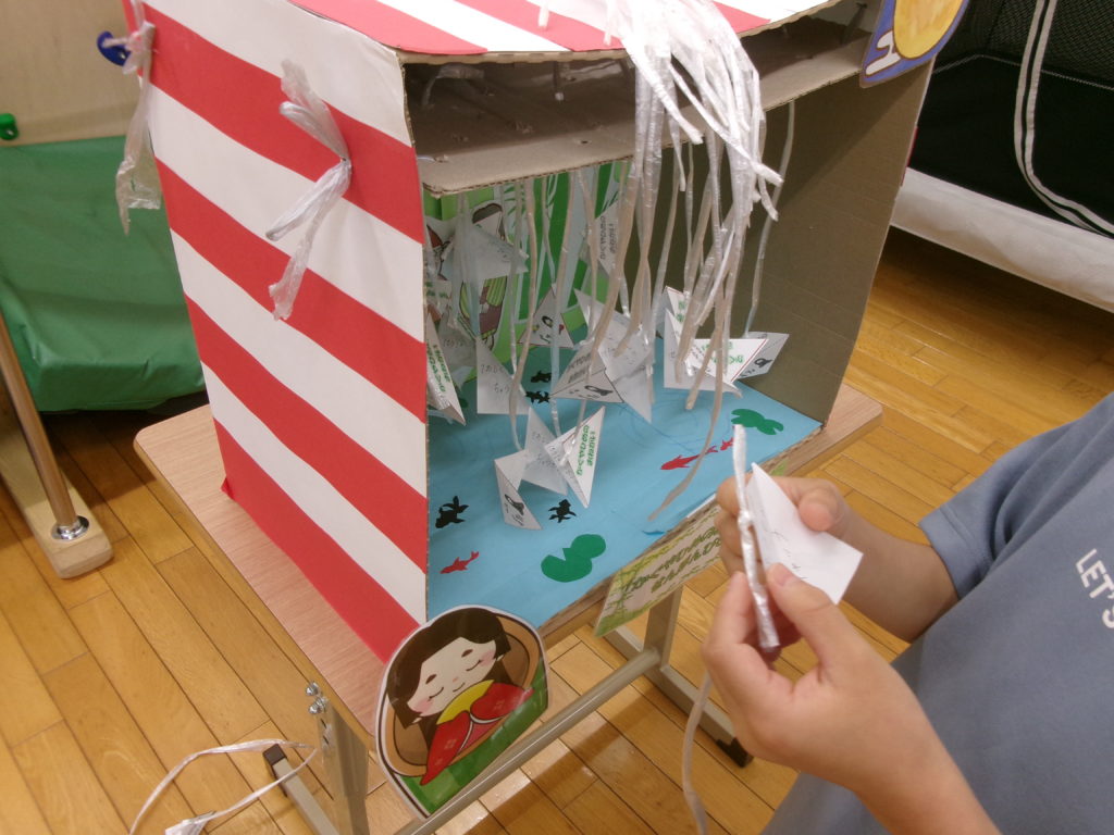 ももたろうやうらしまたろう、かぐやひめのブースがあり、子どもたちはワクワクして参加していました。まず、なつまつりブースにいくためには参加券が必要です。子どもたちは名前が書かれた券をもって入場するとヨーヨー釣りや千本引き、きびだんごつみ等の遊びがありました。子どもたちは自分の好きなブースをまわっていきました。中でもきびだんごつみは子どもたちに大人気できびだんごに見立てた玉入れの玉をたくさんつんでいきました。中には15個以上積めている子もいて、負けないように頑張っていました👏