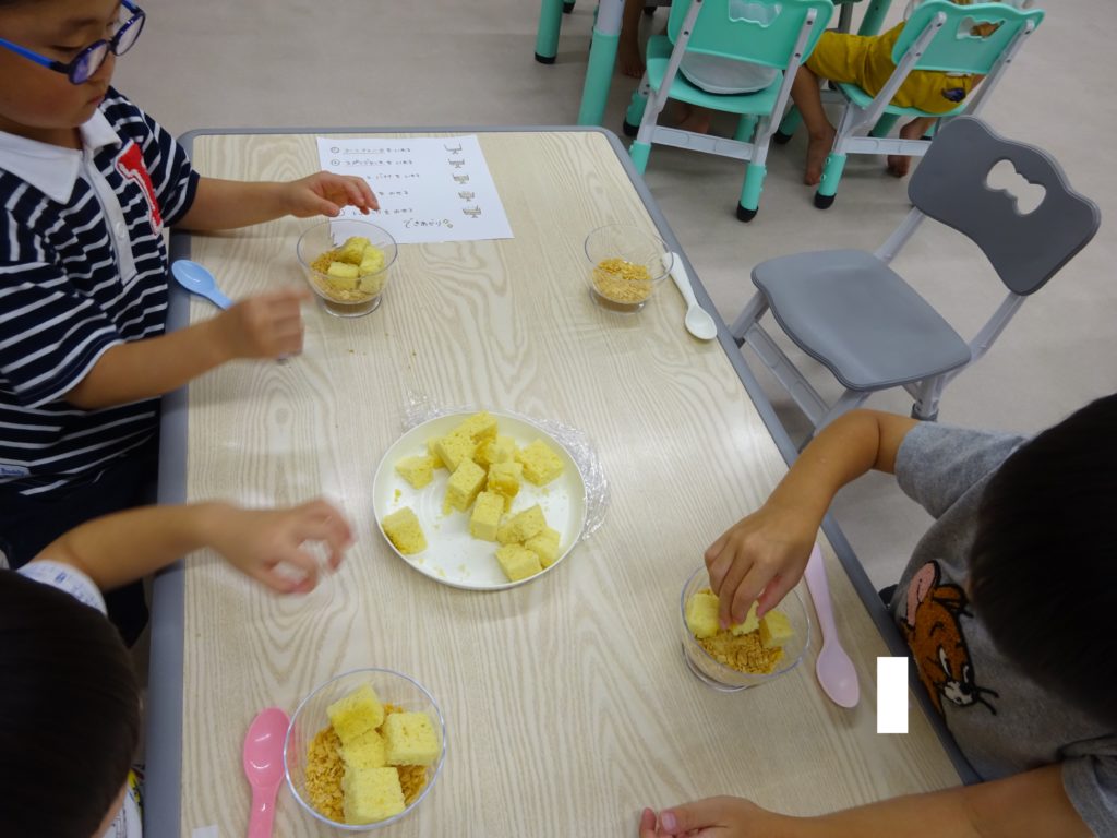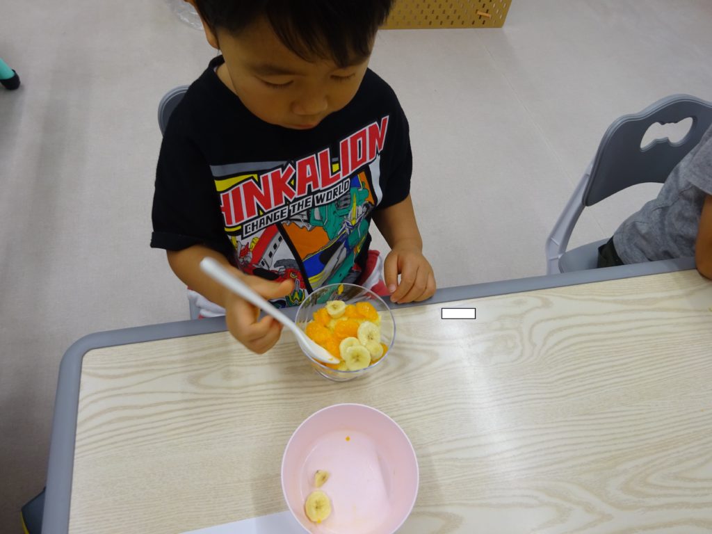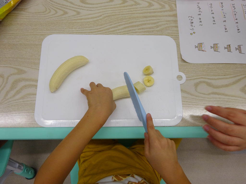 バナナをむいて切るグループ、コーンフレークを細かくするグループで分かれて行いました。バナナは、包丁を使って上手に切る事が出来ましたよ★コーンフレークは棒を使って潰す事が出来ました。