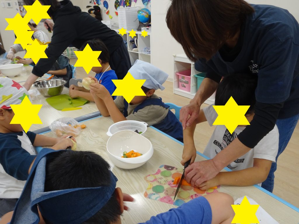 玉ねぎを剥く時、茶色い皮をどこまで剥いていいか迷っている子もいたり、ジャガイモ、ニンジンをピューラーで丁寧にむいている子もいたりしました。