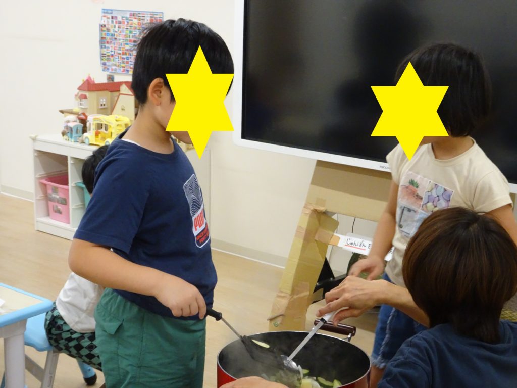 みんなで作って食べる時、「ズッキーニ食べれない」、「お野菜苦手…」と言っている子もいましたが、食べ始めると「ズッキーニおいしかった」、「このお野菜なら食べれる」と言ってたくさんおかわりする子もいました。