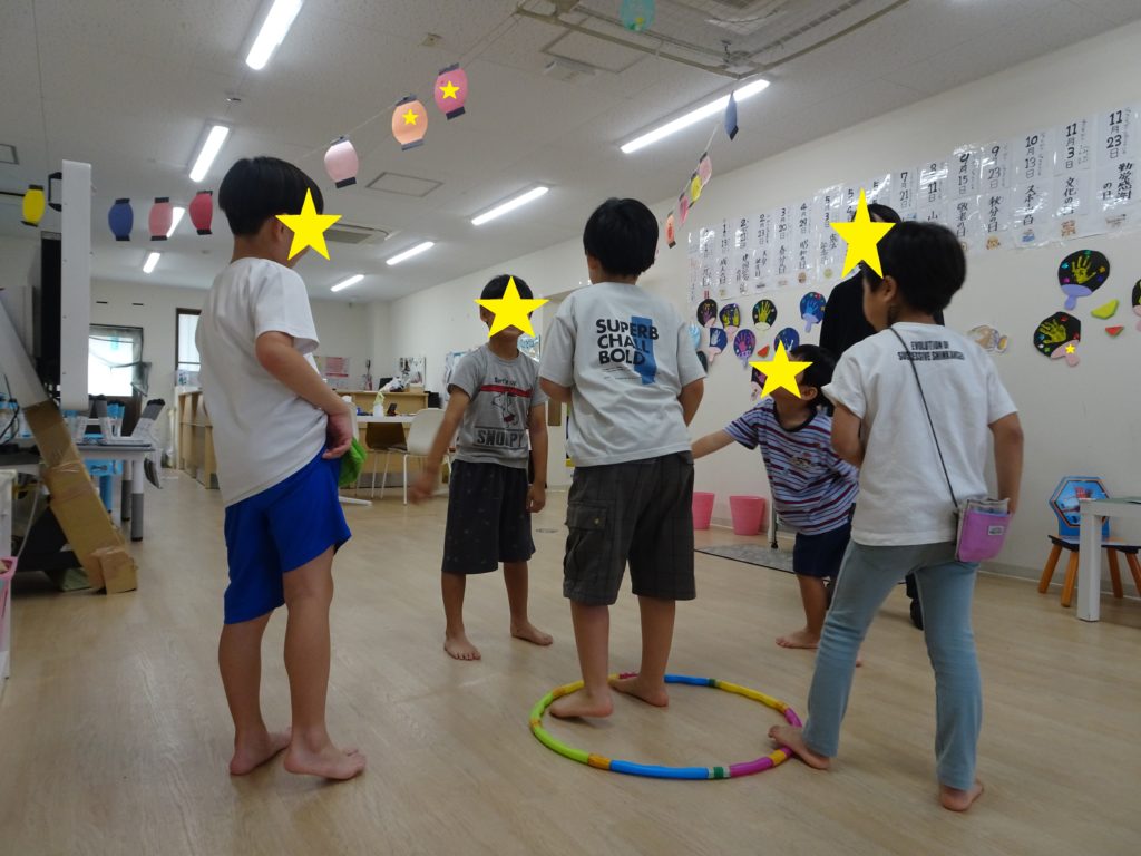 今日は、リーダー探しゲームという真ん中に鬼がいて周りでジェスチャーのようにリーダーを中心にして動くというゲームをしました。