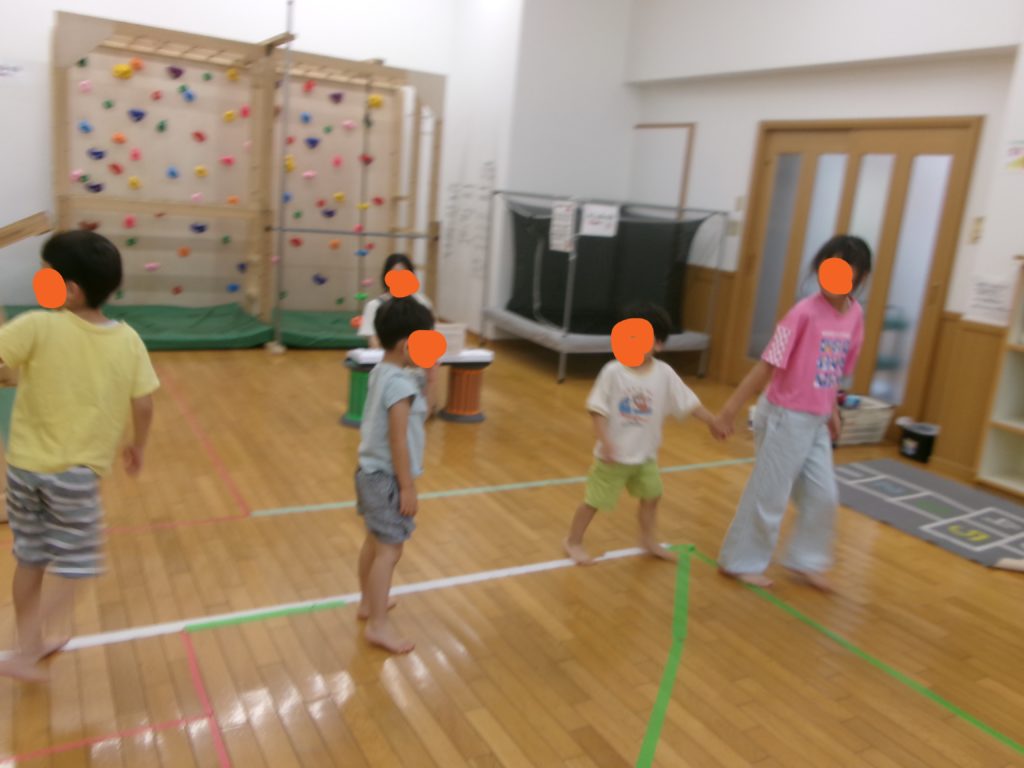 午後は”リトミック”をしました。ピアノの音に合わせて、走ったり歩いたり、動物になりきってみたり。夢中になると音が聞こえなくなることもありましたが、スタッフの指示を聞いて楽しく体を動かすことができました。