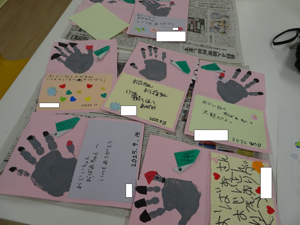2025年09月13日 ゆめなーる稲沢教室 メッセージカード作り&炭酸マグマ 令和7年9月13日(土) 敬老の日をあさってに控えた土曜日企画。おじいちゃんやおばあちゃんに送るメッセージカードを作成しました。表紙はコスモスのブーケ。みんなの手形を鶴に見立て、亀の折り紙と並べて、感謝のメッセージを添えました。午後からは色を付けた水と油と入浴剤を使って「炭酸マグマ」を作りました。シュワシュワと音を立てながら踊る泡に、興味津々でした。 記事一覧に戻る