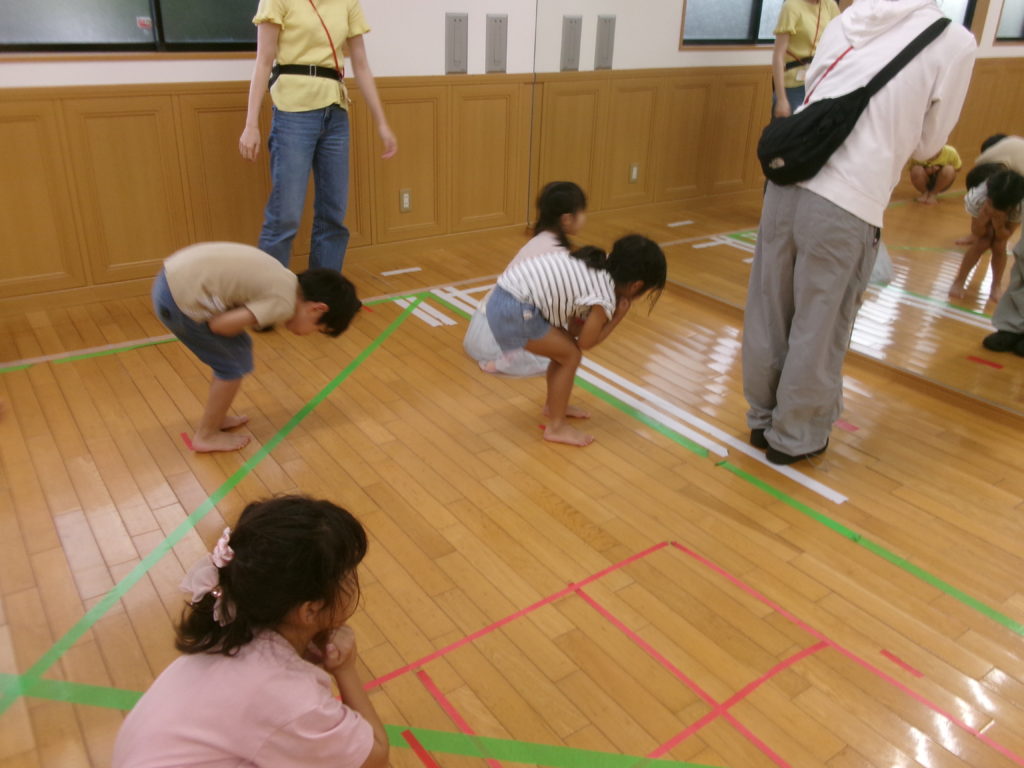 まずは足元に赤い線を引き、その線を前後左右、スタッフの指示を聞いて飛び越えるというトレーニングをしました。前に跳んで、次は後ろに跳んだのに…あれ?最初の位置とずれているぞ?気づいた子は、前後で同じ距離を跳ぶことを意識できたようです♪