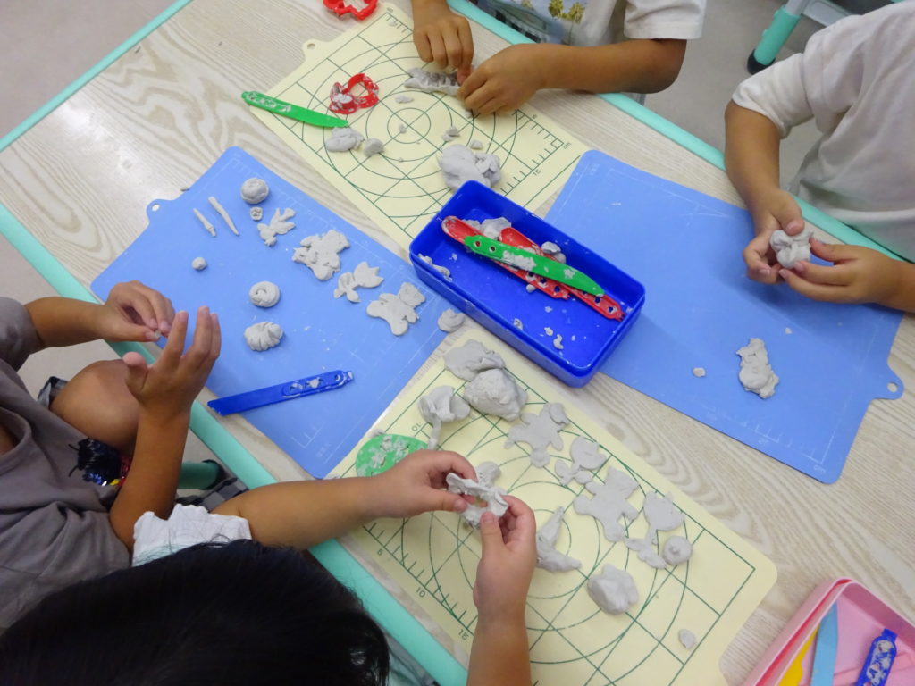 型抜きや粘土ヘラ、めん棒などを使って上手にクマやお花の型抜きをしていました。