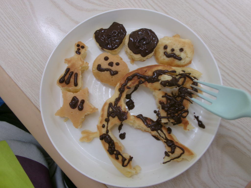 ホットケーキを焼いている間は部屋中にあま~いいいにおいがしてきました。子供たちはいいにおいする!と嬉しそうにパンケーキを見つめていました。