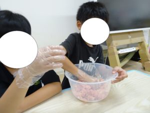 蓮根バーグこねる