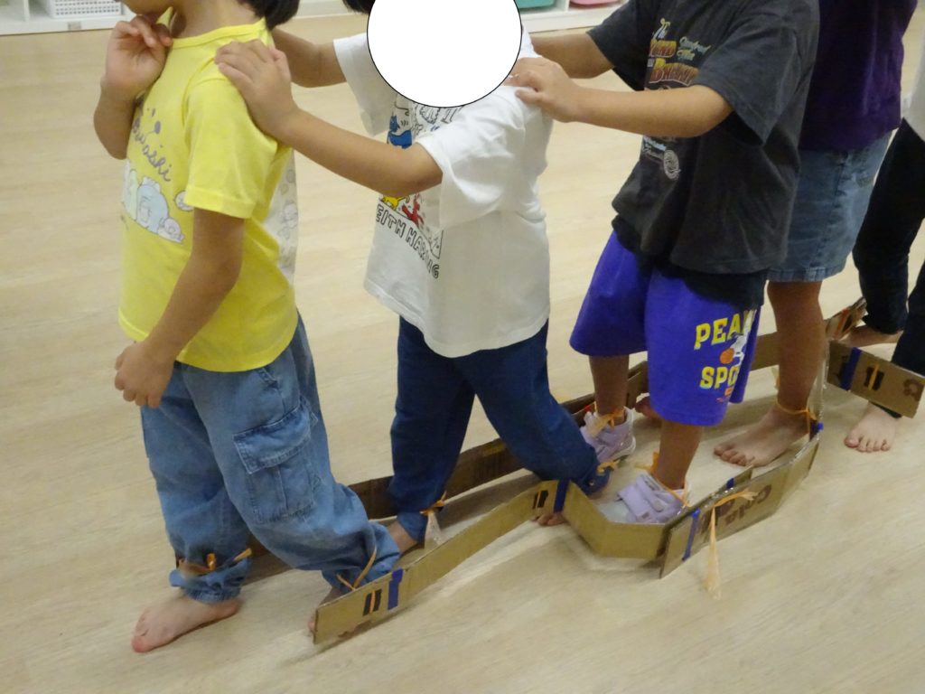 最初は3人ずつに分かれて行いました。右足が赤、左足が青にして「赤・青・赤・青」の掛け声に合わせて足を前に出していきました。息を合わせている班の方が早く進んでおり「協力できているから早いんだよ」とほめると誇らしげでした。一番最後は5人全員で行いました。人数が増えてもお互いに息を合わせて進むことができました✨