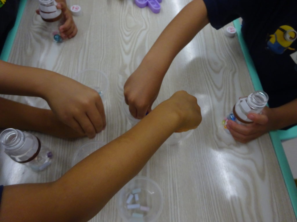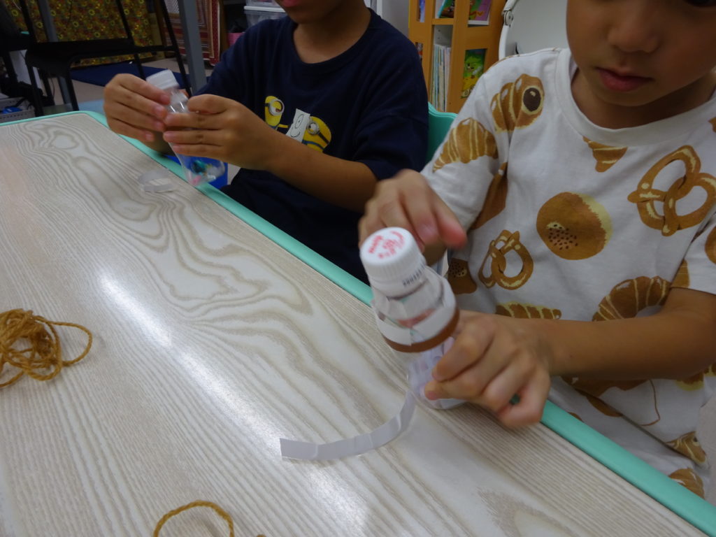 R1のボトルにビーズやストロー、ビー玉など好きな物を入れ、
