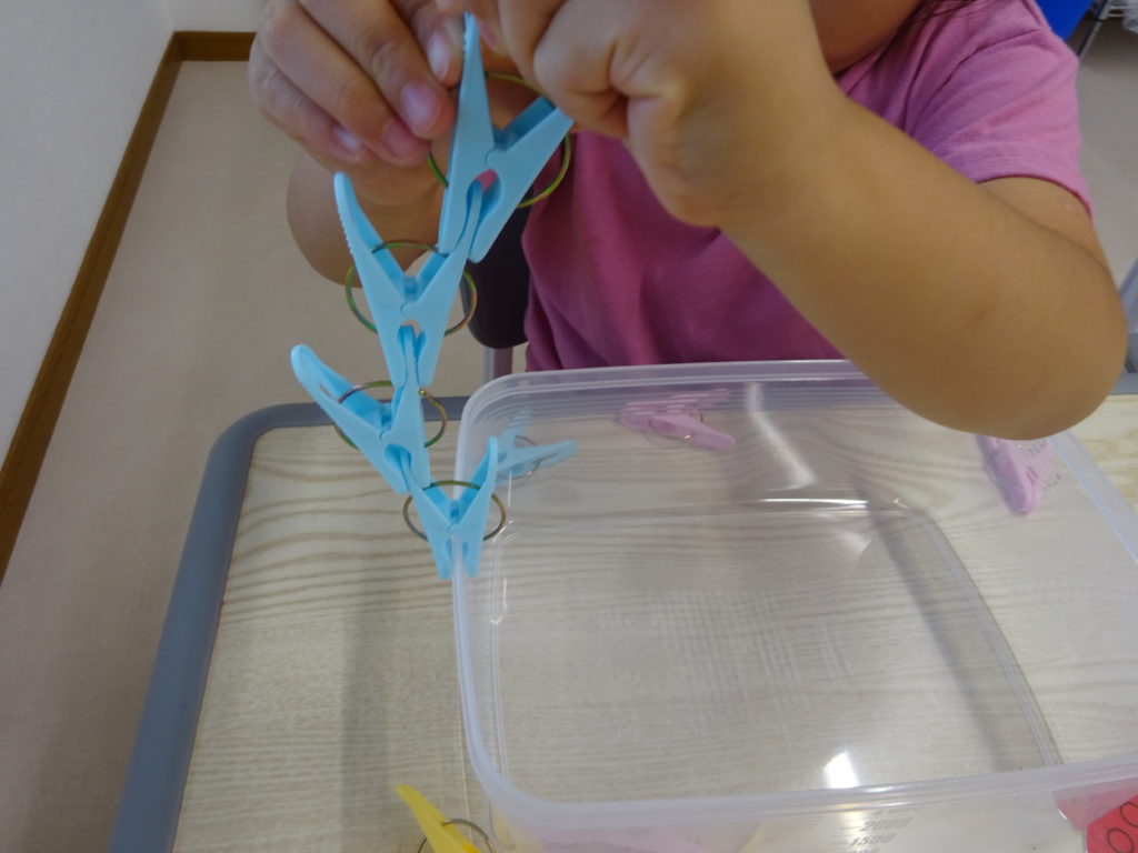 今日は、指先を使って遊ぶ洗濯ばさみ遊びをしました。