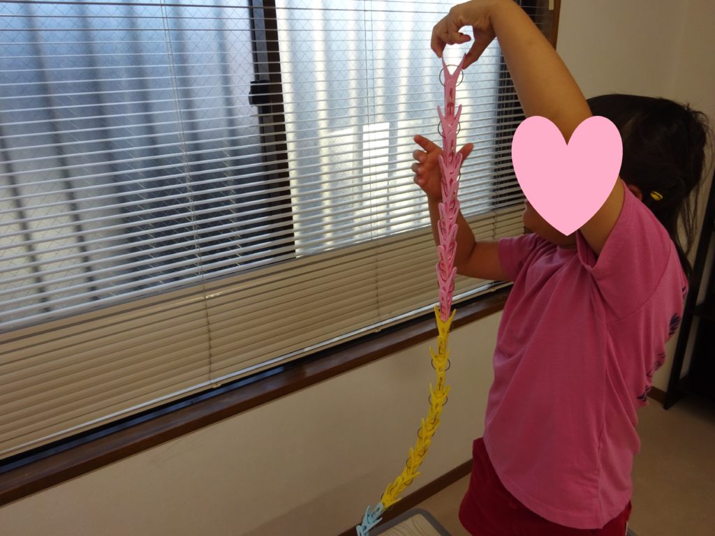 洗濯ばさみ同士をどんどんくっつけて、自分より高くまで繋げていました。