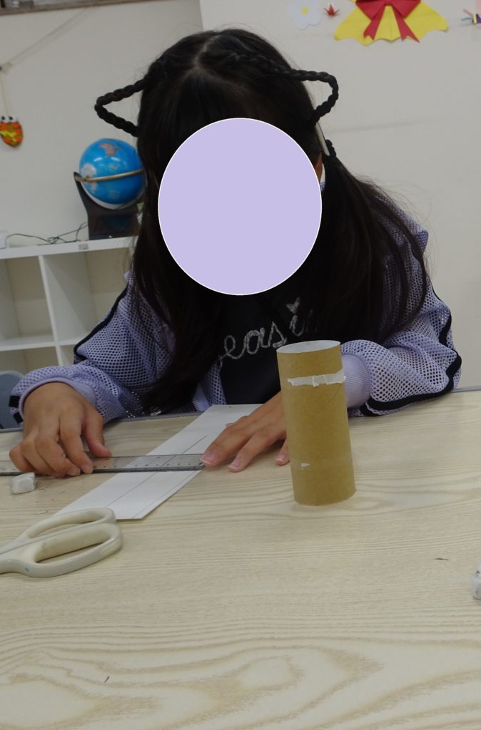午後は万華鏡作りを行いました。自分で物差しを使って画用紙の長さを測りパーツを切り取りました。縦がどの大きさ横はどの大きさと説明を聞きながら頑張っていました。