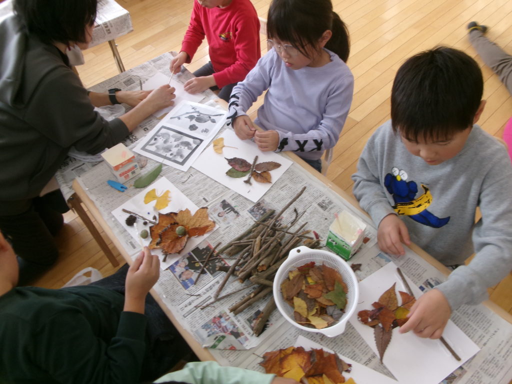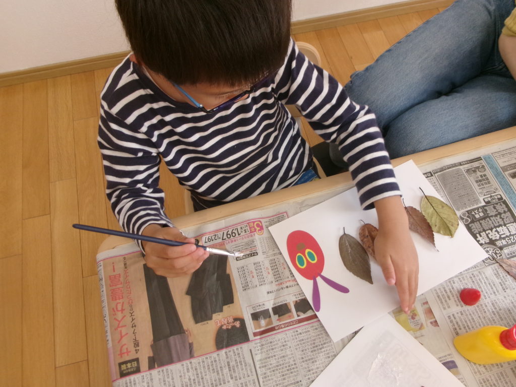 午後活動では、拾ってきた葉っぱや木の枝、木の実を使って落ち葉アートを楽しみました。スタッフが用意した題材を選んだり、小学生の子たちは自分で葉っぱが何に見えるか考えたりしました。ボンドを使うときのお約束もしっかり守って、作っていましたよ!秋らしい素敵な作品ができました👏