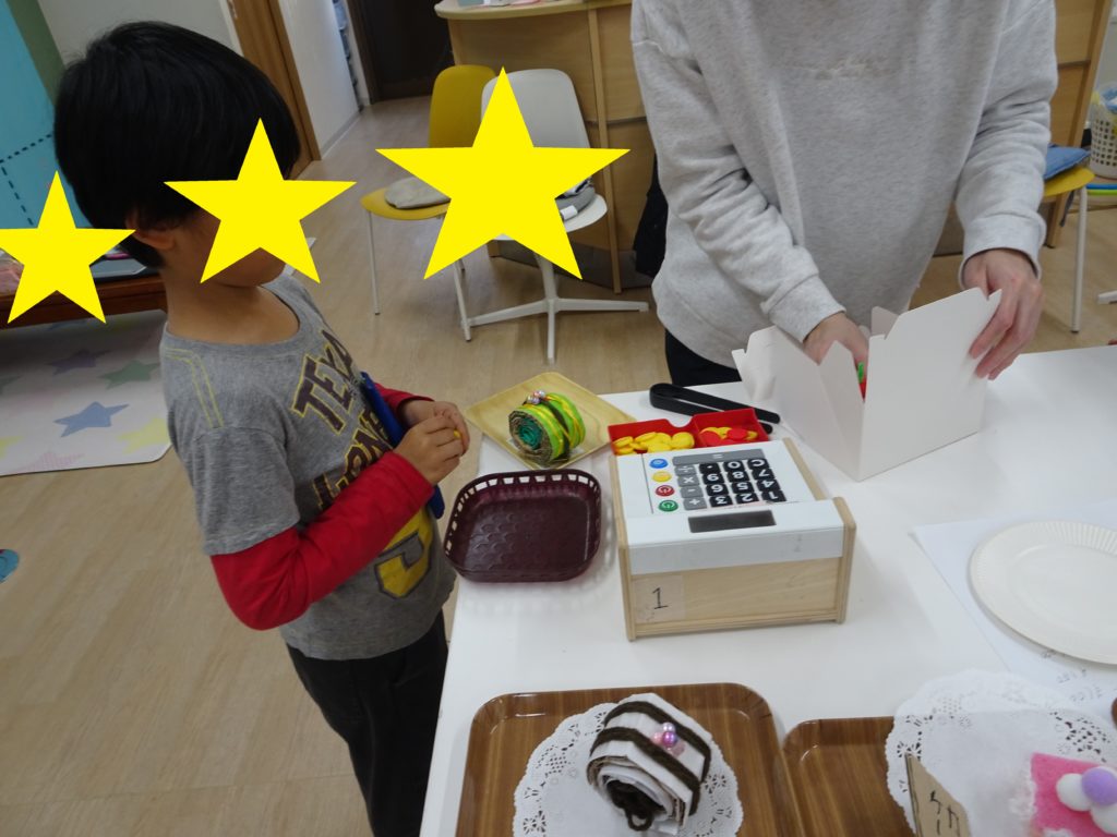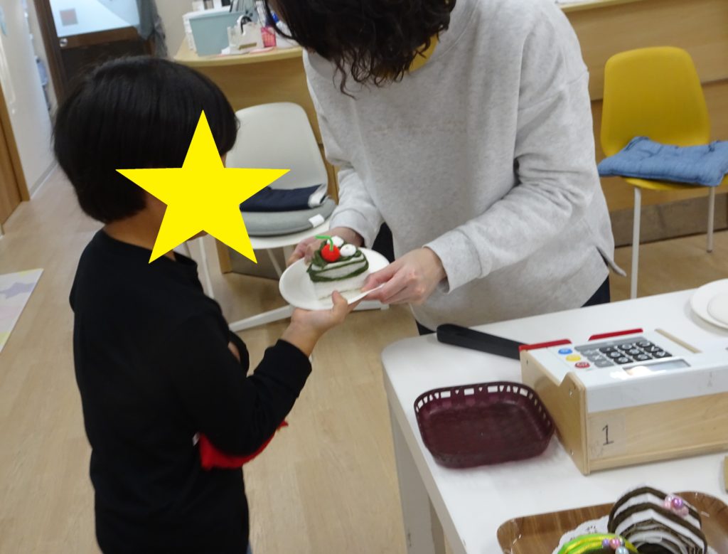 まずは、イートインでケーキを買いました。「○○を一つください」と上手に言えて、お金も計算して出しました。お皿を両手で持つことに戸惑っている子もいました。