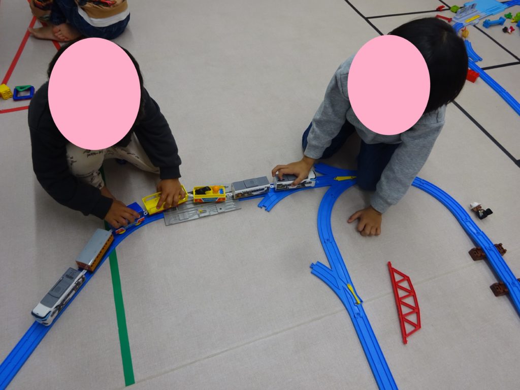 一人のお友だちがプラレールを沢山つかい、大きな一つの線路を作っていると他のお友だちも興味を持ち、「入れて!」とやってきました!快くお友だちを入れてあげるとみんなで電車を走らせて遊び始めました🚄