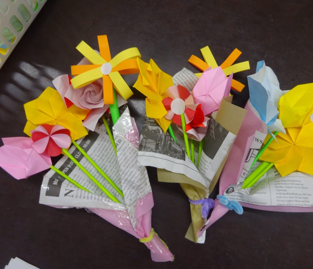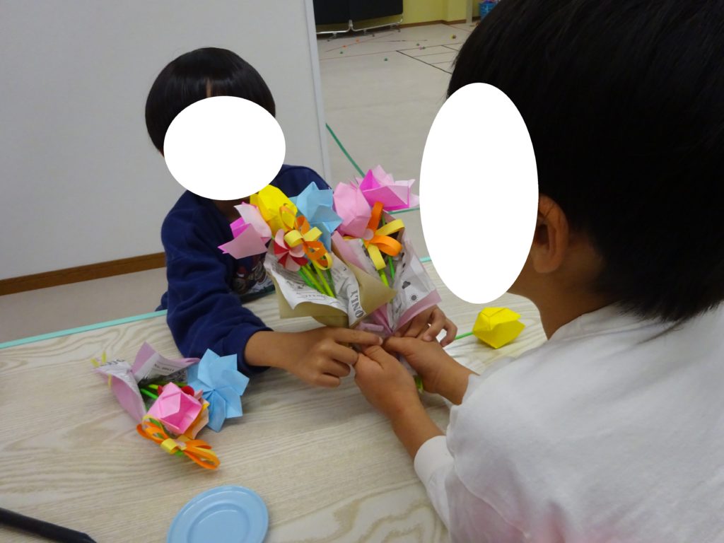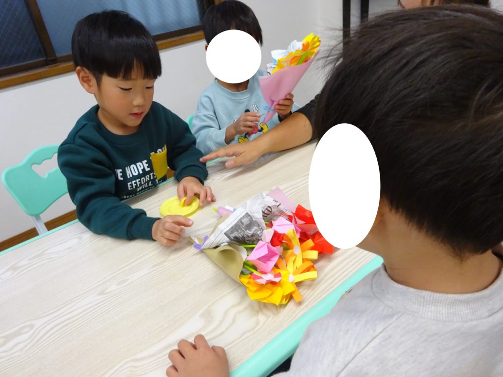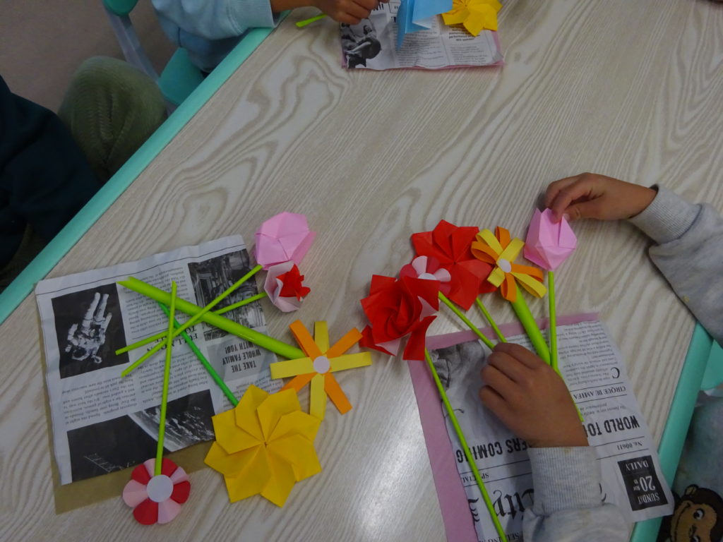 最初に花束作りを行いました。茎作りでは、折り紙をクルクル回して作っていきます。細くすることを意識して巻いていきましたが、徐々に広がっていってしまい太くなっていってしまったりと思うように作る事が出来ず苦戦する姿もありましたが、何度も挑戦し納得のいくまで行う事ができました!できた茎にお花をつけと一輪の花が完成です!