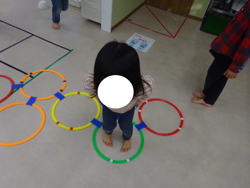 ケンケンパでは、両足跳びをする子が多かったので片足でこうやってやるんだよと伝えると、その動きを見て片足でバランスを取りながら行うことが出来ました。ジャンプするのにどうしても前に行きすぎちゃう姿も見られましたが輪をよく見て飛ぶことを伝える事で集中して行うことも出来ました。