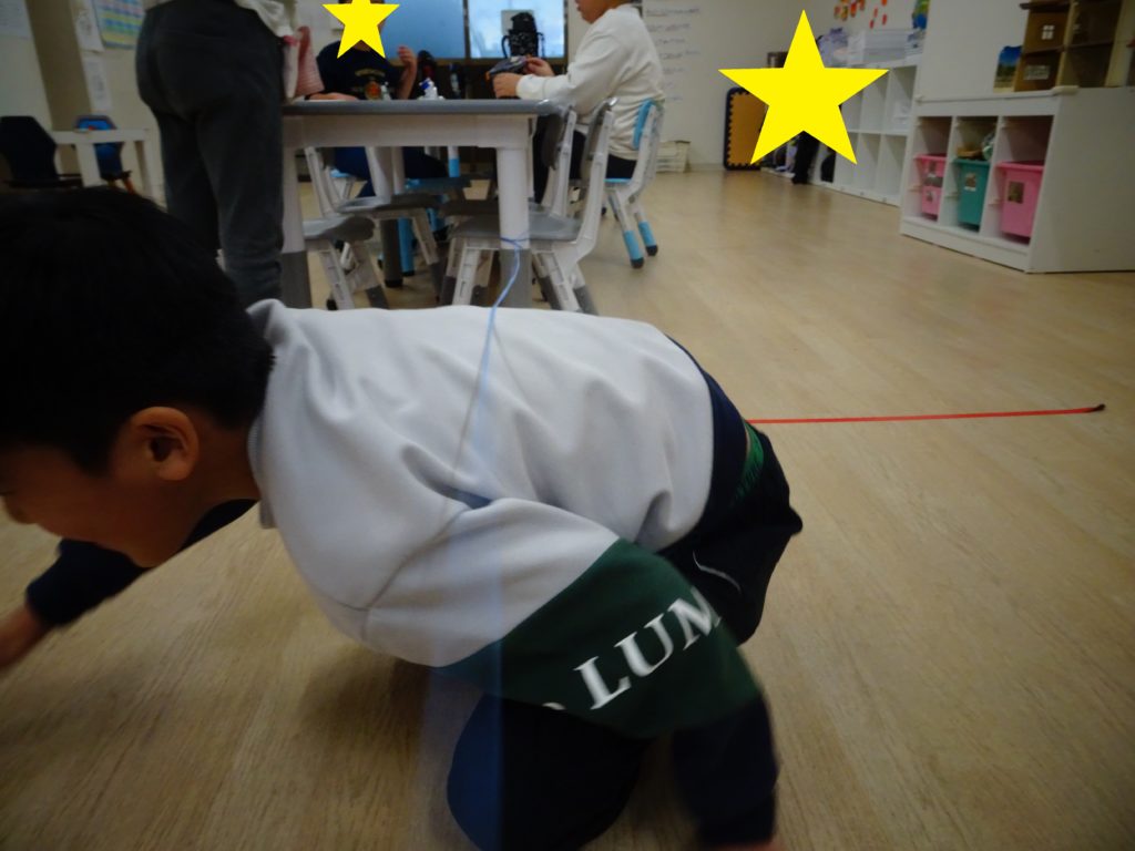 2025年11月28日 ゆめなーる稲沢教室 ひもの上?下?どっちを通る? 令和7年11月28日 金曜日 今日は、ひもを縛り、向こう側に行くためにはどうすればいいか考えながら遊びました。 勢い付けてジャンプ♪ “これはくぐった方がはやいぞ!”と思う子は下をくぐりました。 おっとっと!頑張ってしゃがんだのにひもに当たってぶつかってしまう子も! それでもめげずに最後まで通りました。 今月は“いいこと見つけ”の月間活動でした。 たくさんの子ども達がお友達のいい所を見つけて葉っぱを貼りました。 記事一覧に戻る