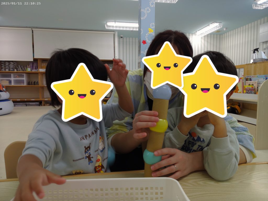 トイレットペーパーの芯とボールを交互に積み上げていき崩れないようにタワーをつくっていきます。指先の細かな調整と力のコントロール、集中力を要しましたが、1分間真剣に取り組むことができました!