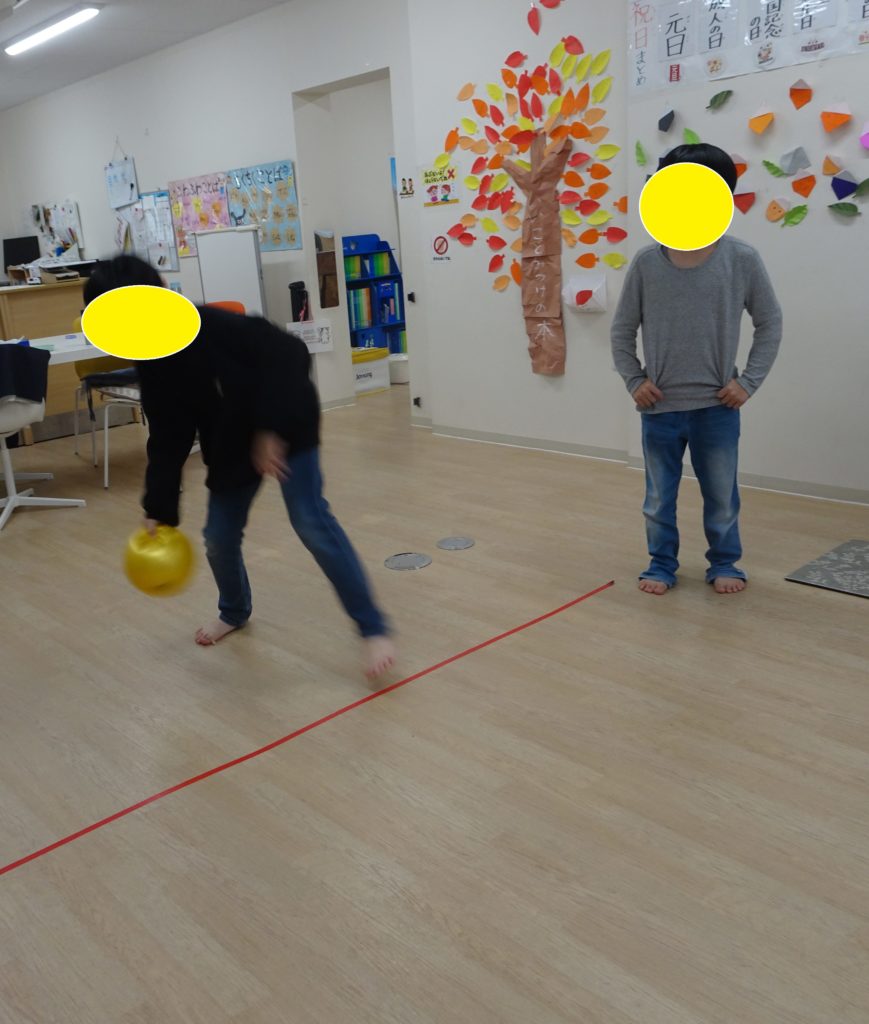 午後からは転がしドッジをして身体を動かして遊びました。ドッジボールと大きいバランスボールの2種類のボールで試してボールに当たらないように逃げ回る子、ギリギリで避ける子とよけ方は様々でしたが息を切らしながら楽しんでいました。休憩を挟みながら何試合も行い、「楽しかった!」と笑顔で話していました。