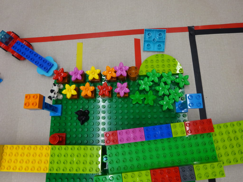 「ぼくは扉をつけるね!」と言ってたくさん扉を探し始める子。お花の形のブロックを見つけて「じゃあ、畑作ろうかな?」と言って緑のお花のブロックをたくさん並べる子とそれぞれ自分の作りたい物を職員が仲介しながらですが、お友だちに伝えながら遊ぶことが出来ていました。